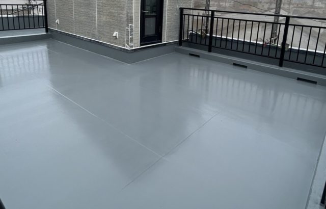 名古屋市中村区積水ハウス3階建て住宅の防水工事です。 いよいよ防水工事の仕上げに入ります。 工事の最後はトップコートの塗布により、全ての工程が完了となります。 仕上げで表面が綺麗に整い、明るく清潔感のある・・・