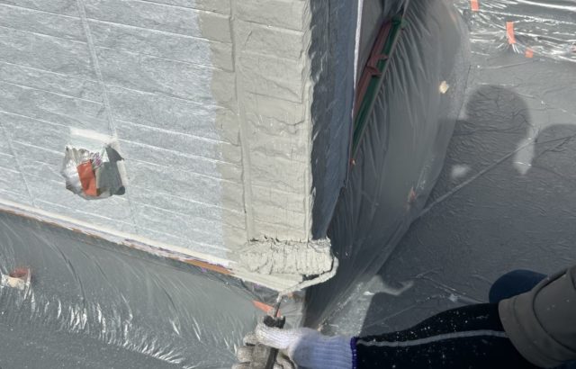 名古屋市中村区積水ハウス3階建て住宅の防水工事です。高圧洗浄で清掃もすみ、補修工事と入ります。 下地の状態を確認したうえで、通気緩衝シートをしっかりと貼り付けます。 このシートは、下地からの水分や湿気を逃がし、防・・・