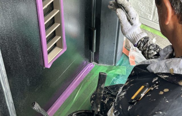 名古屋市中村区積水ハウス3階建て住宅の玄関周り塗装施工中です。 現在、玄関周りの塗装作業を進めています。下地の状態を確認しながら、丁寧に施工を行っています。 玄関はお住まいの顔ともいえる大切な場所ですので、見た目の美しさにも配慮し、きれいな仕上がりを目・・・