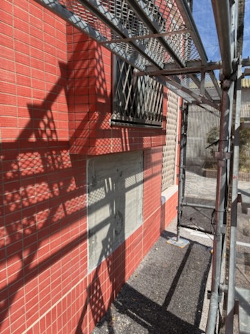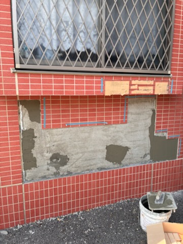外壁タイルの一部に浮き・ひび割れ化や不具合が確認されたため、部分的な補修工事を行います。まずは、浮きやワレのあるタイルを工具で慎重に剥がし、古い接着モルタルを削り表面を平らに整えます。